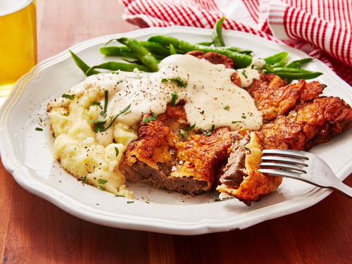 Chicken Fried Steak, Mashed Potatoes, Green Beans, Rolls